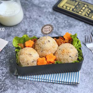 把保鲜膜包起后握紧,把饭团握成圆形,这样就完成了,一人份的米饭大概可以做三个饭团。