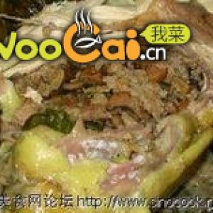 将酒坛泥碾成粉末,加清水调和,平摊在湿布上(约1.5厘米厚),再将捆好的鸡放在泥的中间,将湿布四角拎起将鸡紧包,使泥紧紧粘牢,再去掉湿布,用包装纸包裹