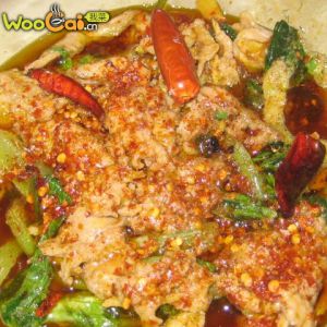 起锅时将菜放在下面打底,肉片倒在上面。放入干辣椒末。