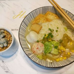 下米粉,鱼丸煮4分钟,放自己喜欢的青菜即可