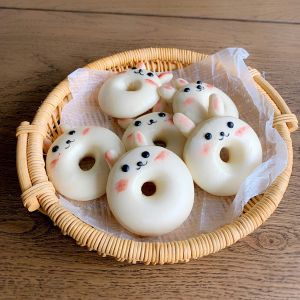 嘴巴部分搓成细长条借助牙签面团蘸取适量清水固定好 最后干刷子洗蘸取适量红曲粉刷上腮红 耳朵部分也要刷一点