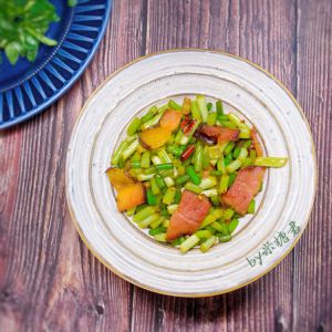 锅内倒一点点油,油温5成热,中火煸炒腊肉,直到肥肉部分变得半透明,盛出腊肉,油留锅中。