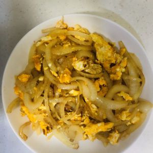 洋葱鸡蛋混合翻炒,加生抽、盐调味