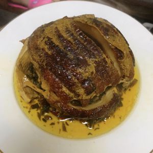 (忘拍上一步摆肉照片了,我就直接写出来)五花肉肉皮朝下整齐的码放碗中,把炒的梅干菜填在上面,放入蒸锅中蒸约2个小时