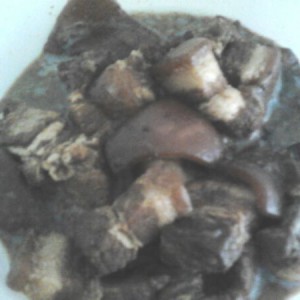 锅上做水,把肉焯一下,然后捞出,洗净,切成一厘米见方的小块儿。
