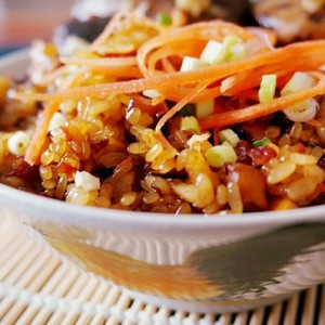 下新油爆香腊味香菇至出油,趁热把糯米饭倒入,加入虾米,酱油和老抽调味,太干的话适当加一点热水炒至适口就成。