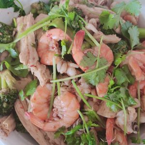 加入虾炒至变色,依次加入西蓝花和腐竹翻炒入围即可。(到这里跟据个人口味淡咸就可再次添加入盐,生抽类的调料)