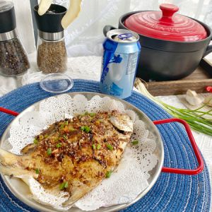 鲳鱼洗净擦干,表面用刀割出花纹(方便肉质入味),用料酒给鱼做个十足的马杀鸡,摆上姜片,撒上适量花椒