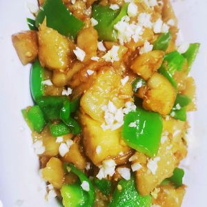 圆茄子切块,放盐腌制5分钟,让盐把茄子水逼出来
