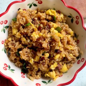 热锅冷油加入切好的葱末,炒香后加入腊肠丁(腊肠是我提前用锅蒸了10分钟的)随后加入青椒丁,超出香味后加入拌好的米饭,边抄边尝,加入少许鸡精,少许盐就可以出锅啦