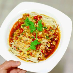 金针菇凉了之后,沥水,差不多之后就可以摆盘了,然后酱汁淋上去。再放一个香菜,装饰一下,完美。