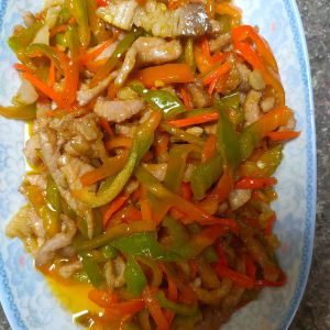 锅里加油放蒜末炒香加青椒,胡萝卜丝炒熟
