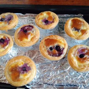 蛋挞出炉了,加了蓝莓,在烤制的过程中蓝莓会爆汁,淡淡的甜味儿比肯德基卖的都好吃。