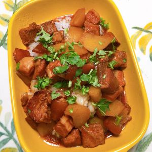 可以加胡萝卜香菇一起炖煮,快出锅时加青椒味道很好,如果肉特别肥,炒糖浆时多炒一会把肉里的肥油炒出来