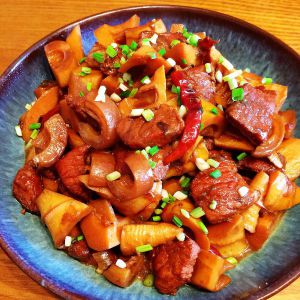 加水大火烧开 再转小火慢慢炖40分钟,再大火收汁,装盘撒上香葱,一道美味的春笋红烧肉就做好了~