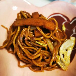 先炒洋葱丝,火腿肠炒好后盛出炒蛋,然后混合加面,老抽 醋 糖 如果掌握不好可以关火翻炒