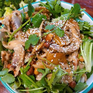 撒上花生米(我直接在蔬菜店买的油炸花生),撒上切成段的香菜和白芝麻,就可以了