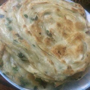 油酥,20克面粉,5克盐,十三香,放碗里浇适量的热油,搅拌成黏糊的样子。切葱放在另外一个碗里。