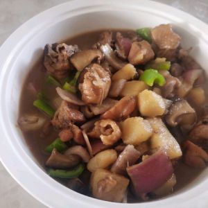 腌制过程,把土豆、香菇、尖椒、洋葱,洗净,切块儿备用