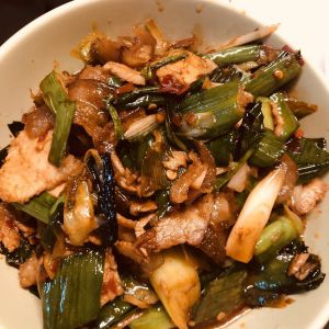 加入郫县豆瓣继续翻炒加入蒜苗继续翻炒
