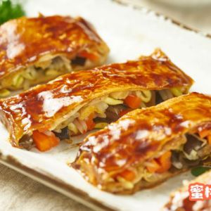 将盛出的豆皮包切块,好看又好吃的素烧鹅就做好啦~