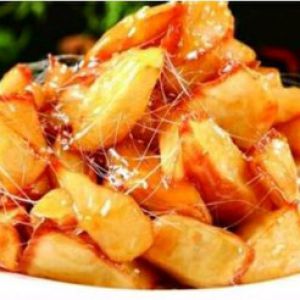 在锅中放入适量的白糖,加一点点水,小火熬成糖浆,等糖变色冒泡,加入刚刚炸好的红薯迅速翻炒,关火冷却一下,就可以出锅啦☆