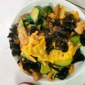 准备食材,黄瓜切片,木耳撕成块,瘦肉切成片,加少量生抽,盐,油,淀粉腌10分钟备用。