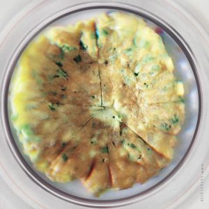 热锅凉油,油热换小火倒入蛋液,成型后翻面