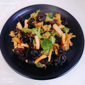 2.葱姜蒜辣椒爆香加入香菇翻炒均匀加入西蓝花和木耳,翻炒均匀加适量生抽老抽耗油、白糖、少许水、盐、五香粉翻炒5分钟左右即可。