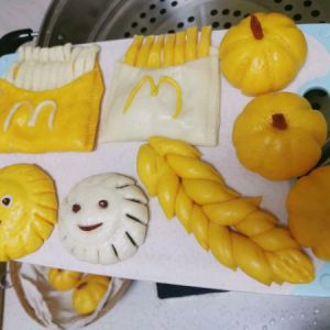 醒发好的南瓜面团,和牛奶面团,团好的豆沙球备用(南瓜面:南瓜上锅蒸熟,碾压成泥状,放入适量面粉加入酵母粉和牛奶`糖和面;白面团:面粉加入酵母粉牛奶醒发)