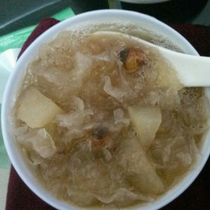 水开后倒进电饭锅里,用煲汤模式炖一小时,银耳变软后加入冰糖,再炖15分钟即可