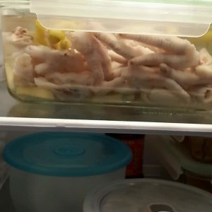 买好的泡椒倒入适量,放盐,兑入凉白开,放入鸡爪