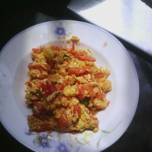 油烧好后,先放入西红柿炒2--3分钟左右后,再将拌匀的鸡蛋放入锅内