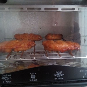 开始烤了,先预热烤箱,200度。把鸡翅放到烤架上,在下边的屑盘里铺上锡纸,230度,十分钟