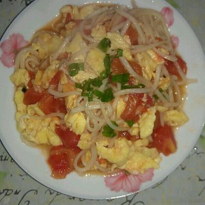 第三步:锅内放入西红柿、鸡蛋和热水(大概500ml),根据个人口味放入盐和糖,稍微搅拌后倒入面条,继续搅拌,然后放少许水淀粉,翻炒几下装盘。
