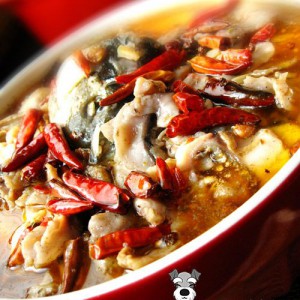 在锅中,放入30克油,烧到冒烟。把第一次爆香盛出的辣椒花椒洒在鱼汤的表面上。把烧热的油,迅速倒在盆中,听到好听的嗤嗤声,美味无比的水煮鱼汤就做好了。