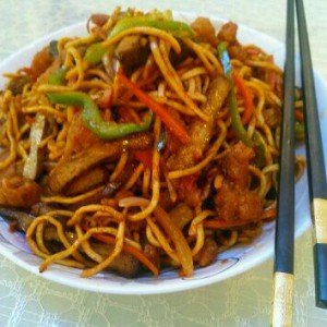 锅烧热放入食用油,把肉丝先炒,依次把豆干、胡萝卜丝、洋葱放入翻炒!炒软了就放入面条。一勺鸡精,半勺白糖,两勺生抽。把面条炒均匀。放入少许清水,适量辣椒面。起锅前把青椒丝放里面炒一会就好了。面条不需要炒太久,本身是熟的!