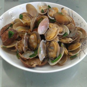 倒入花蛤翻炒,加点料酒,加点生抽,加入葱花,马上起锅。整个过程用中火或大火,时间约一分钟。