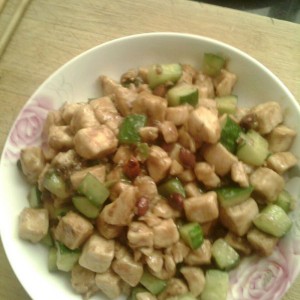 把鸡脯肉切丁,洒上盐和淀粉,搅拌