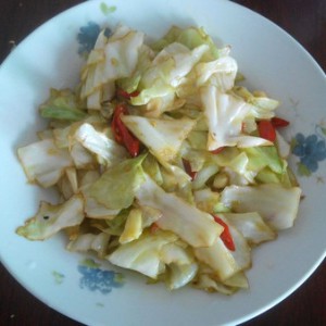油热后放小米椒翻炒,再倒入包菜,微微变色后加盐,酱油