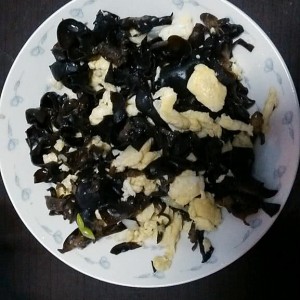 把鸡蛋打碎,炒好,盛盘,木耳切两下