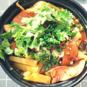 再起锅烧油,加入青花椒,小米辣,姜片,蒜瓣,火锅底料,炒出红油,加入郫县豆瓣酱,加入清水,加入鸭血,蔬菜,苕皮,香菜等