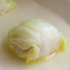 取适量猪肉放在白菜叶上,从下往上卷好,卷到绿叶的地方把两侧往里折