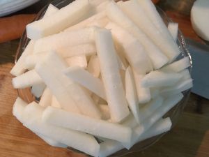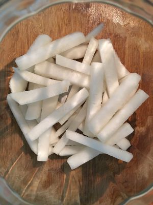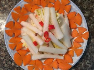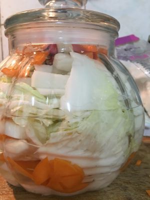 放入白糖、白醋.盖上盖子腌制一天.白醋放玻璃罐的二分之一就好.因为一会萝卜和白菜的水分会出来.不喜欢吃太酸的朋友可以多放点白糖.腌制半天的时候记得打开盖子翻一下,让每一块都能沾到腌汁.