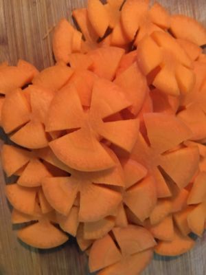 胡萝卜洗净擦干.切成小花瓣.也可以切成小条.我是为了好看.