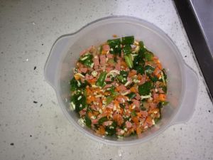 馅料火腿,香葱,胡萝卜切碎,马苏里拉奶酪碎,放入适量盐,黑胡椒粉搅拌均匀备用。