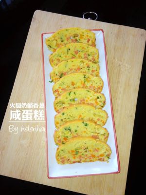 这样简单美味的火腿奶酪香葱咸蛋糕就做好了~!开吃