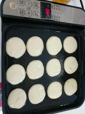 电饼铛刷一层油,开启饼铛上下盘加热功能,用勺子舀面糊,淋小饼到电饼档上。