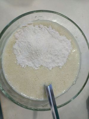 把搅好的香蕉糊都倒入碗内,放入面粉轻轻搅拌均匀(面粉要一点点的加入)。