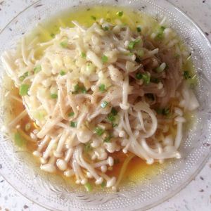 尽可能整齐的排好,等捞完以后把盆底多余的水滗干!依次放盐,鸡精,入蒜末,姜末,葱末,蒸鱼油,少许香油,用一口干净的锅烧热,加入花生油,再加少许菜籽油,因为菜籽油的加入会使凉拌菜更加香,起到画龙点睛的作用,等烧到油有一点点冒烟了,淋到金针菇上面。